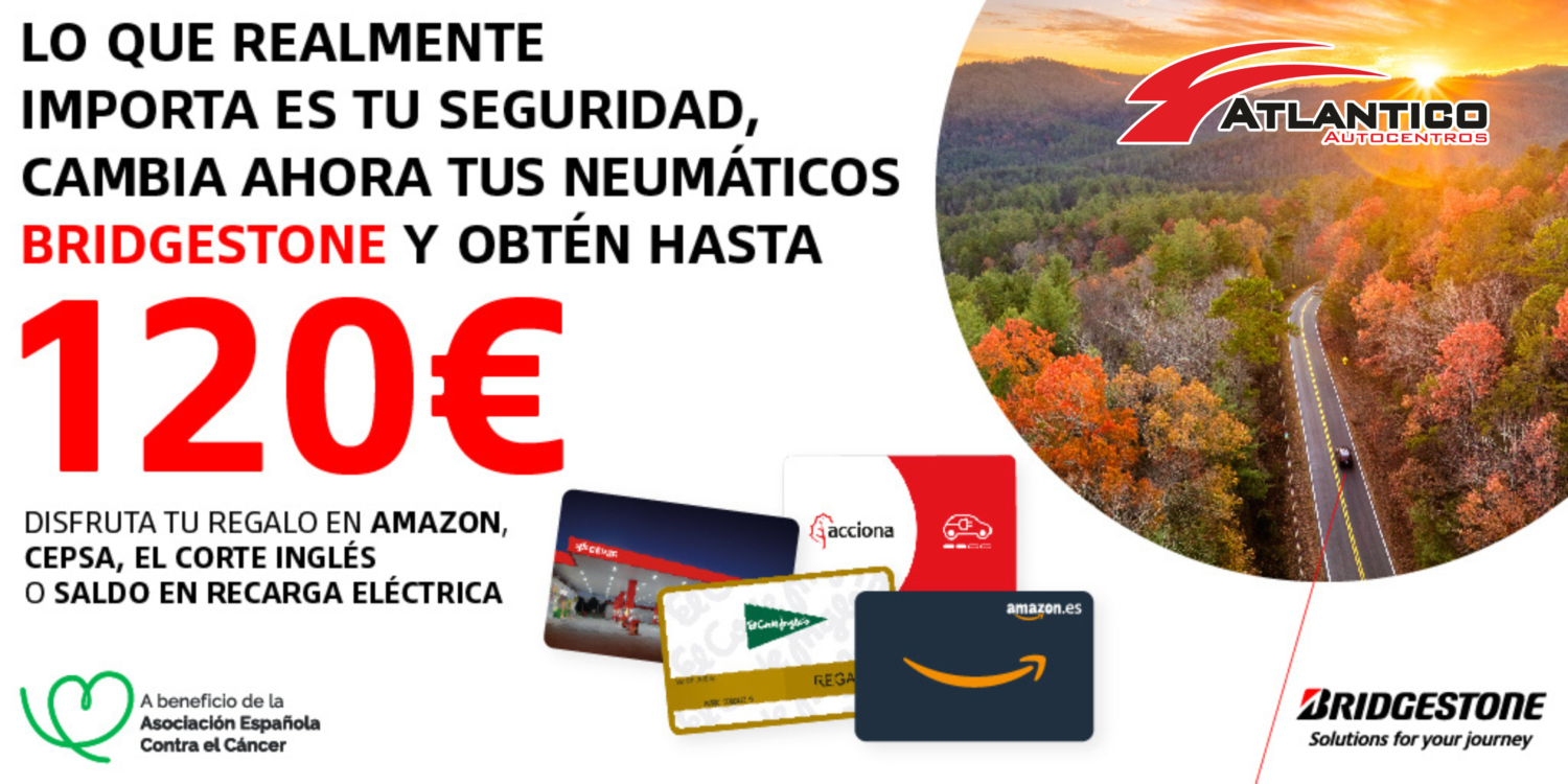 Del 1 de octubre al 15 de noviembre, compra neumáticos Bridgestone (turismo, 4×4 o furgoneta, desde llantas 17”) y gana hasta 120€ en tarjetas regalo para disfrutar donde quieras: Amazon, Cepsa, El Corte Inglés o recarga eléctrica.